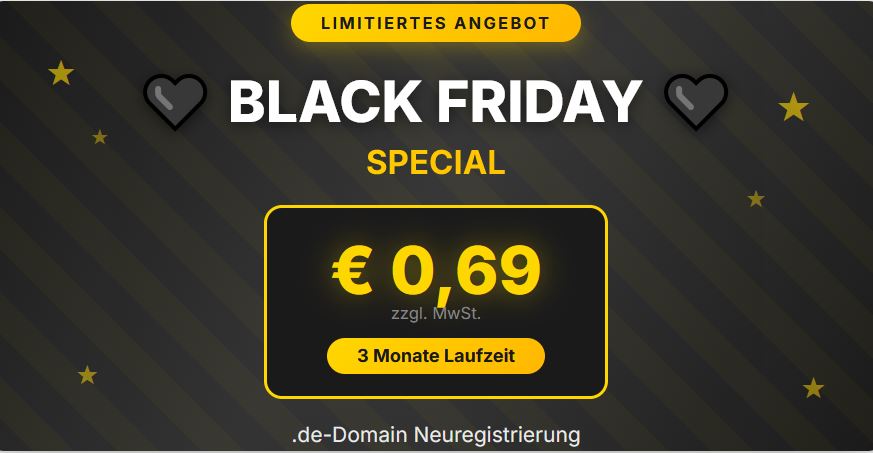 Jetzt zum Black Friday bekommst du bei DomainCatcher.com unsere günstigsten Preise: .de-Neuregistrierungen bereits ab 0,69 € netto (für 3 Monate Laufzeit).